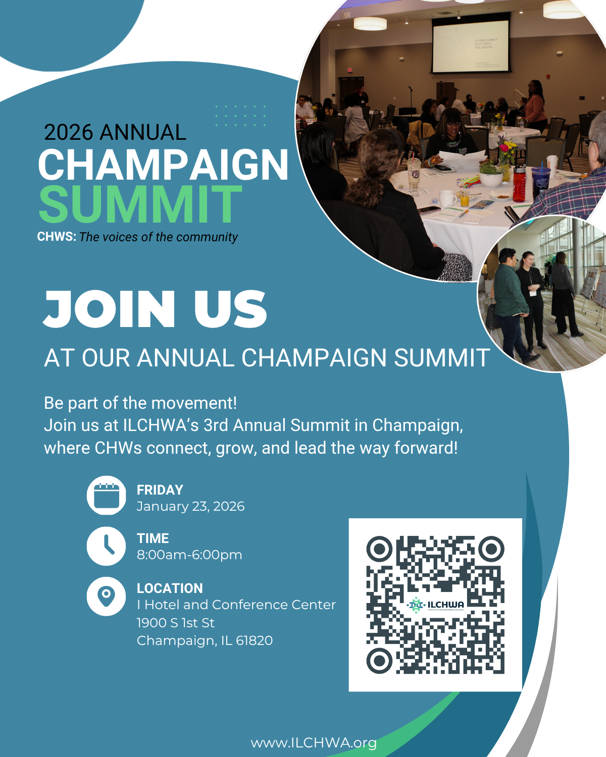 Join CHWs from across the state for our 3rd Annual Summit—a day of learning, connection, and community impact. Hosted by ILCHWA at the I Hotel in Champaign, IL. This year’s event will feature expert-led sessions on key issues including health equity, healthcare access and more.